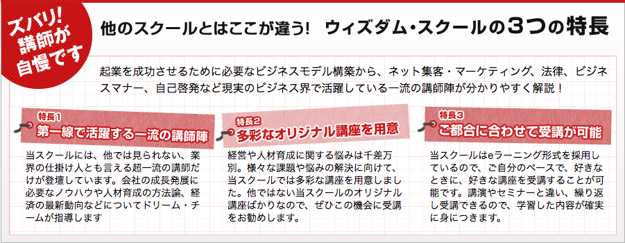 このウィズダムスクールは日本経済に貢献する経営者や経営幹部の方を対象とした学校です。忙しい経営者がいつでもどこでも経営に役立つ内容だけを学習できるeラーニングです。横浜校では数ある講座の中から、売り上げアップに即効性のある講座、経営情報収集の講座、レベルアップにつながる講座の15講座を厳選しお届けします。専門家の知識を経営に活かしてくださることを心から願っております。